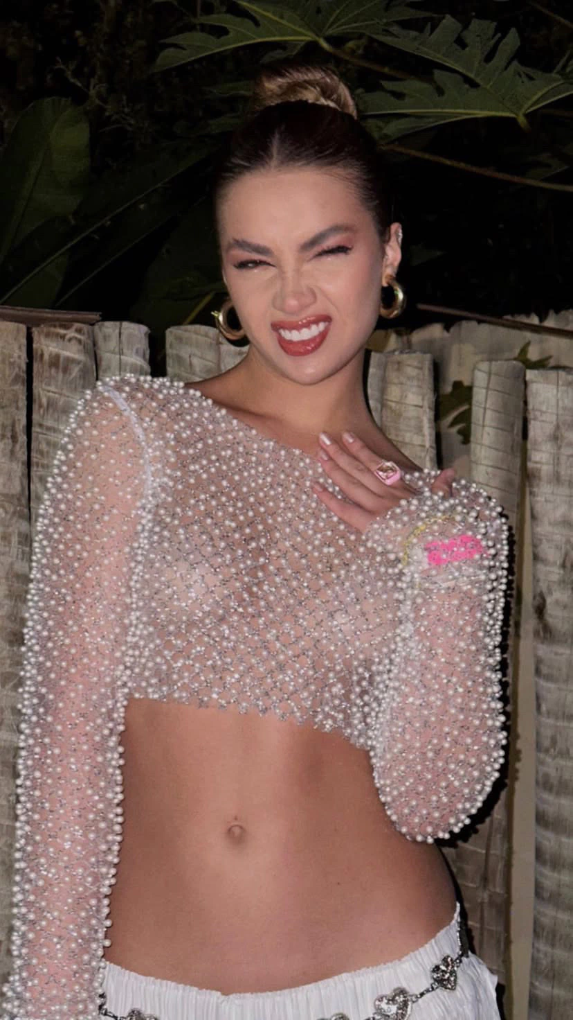 BLUSA PRETA CROPPED DE TULE, MANGA LONGA, COM APLICAÇÃO DE PÉROLAS E PAETÊ. PEÇA COM TRANSPARÊNCIA. FORRO VENDIDO SEPARADAMENTE.