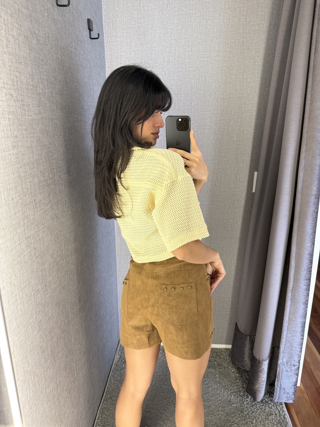 SHORTS DE COURO COM TAXAS, FECHAMENTO COM ZIPER, POSSUI BOLSOS FRENTE E COSTAS. ACOMPANHA CINTO. TECIDO COM POUCA ELASTICIDADE.